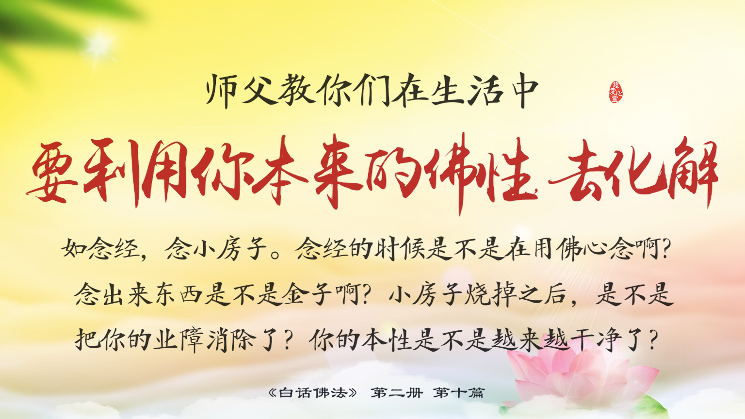 不限会员 2-10-6 要利用你本来的佛性,去化解...念经的时候是不是在用佛心念啊?念出来东西是不是金子啊?小房子烧掉之后,是不是把你的业障消除了?你的本性是不是越来越干净了?.【图】