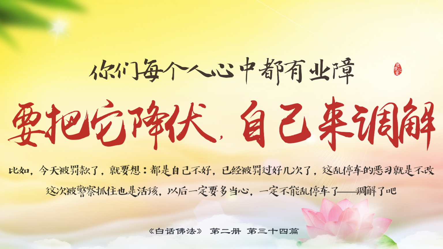 不限会员 2-34-5 你们每个人心中都有业障,要把它降伏,自己来调解。比如,今天被罚款了,就要想:都是自己不好...这乱停车的恶习就是不改...以后一定要多当心,一定不能乱停车了——调解了吧.【图】