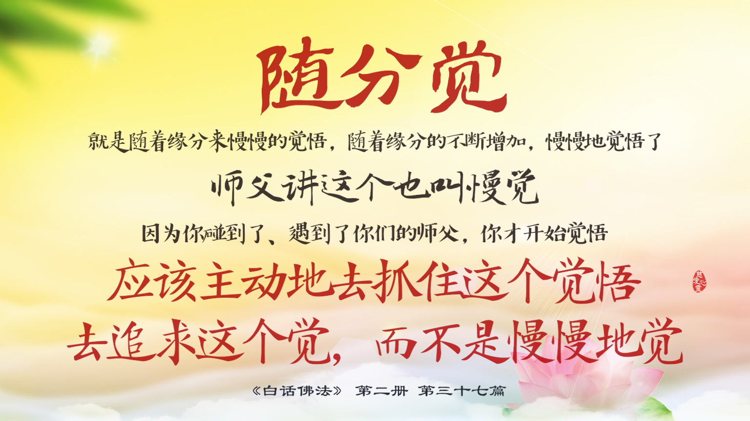 不限会员 2-37-42就是随着缘分来慢慢的觉悟,随着缘分的不断增加,慢慢地觉悟了。师父讲这个也叫慢觉,因为你碰到了遇到了你们的师父,你才开始觉悟。应该主动地去抓住这个觉悟,去追求这个觉.【图】