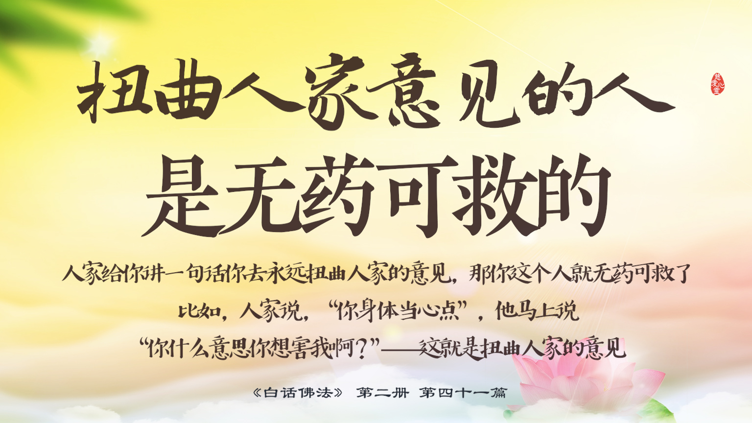 不限会员 2-41-23 人家给你讲一句话你去永远扭曲人家的意见,那你这个人就无药可救了。比如,人家说,“你身体当心点”,他马上说,“你什么意思你想害我啊?”——这就是扭曲人家的意见。.【图】