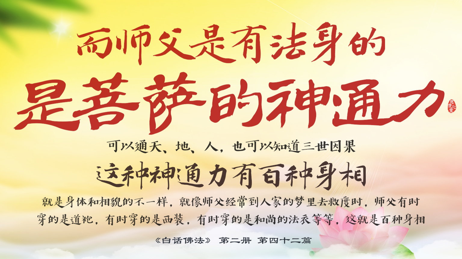 不限会员 2-42-4师父是有法身的是菩萨的神通力,可以通天地人,也可以知道三世因果。这种神通力有百种身相...师父经常到人家的梦里去救度时,师父有时穿的是道袍西装法衣等等,这就是百种身相.【图】