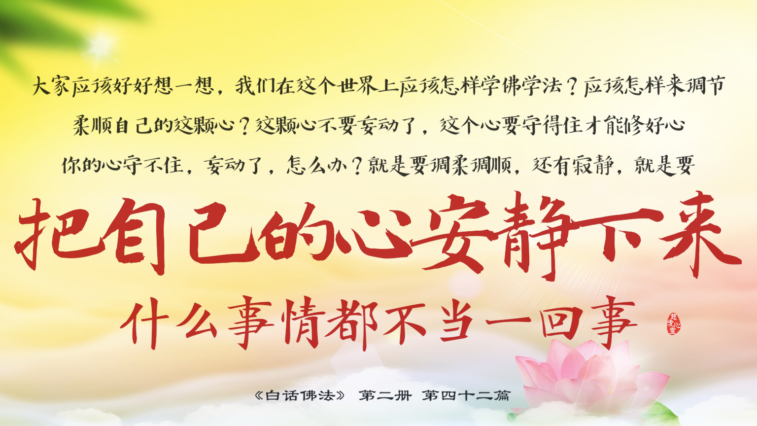 不限会员 2-42-28 我们在这个世界上应该怎样学佛学法?应该怎样来调节柔顺自己的这颗心?....就是要调柔调顺,还有寂静,就是要把自己的心安静下来,什么事情都不当一回事。.【图】