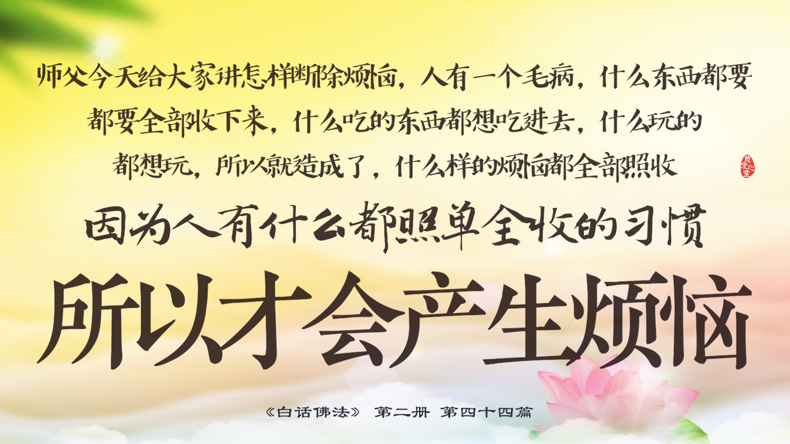不限会员 2-44-1 怎样断除烦恼,人有一个毛病,什么东西都要都要全部收下来,什么吃的东西都想吃进去...玩的都想玩,所以就造成了烦恼都全部照收。因为人有什么都照单全收的习惯...才会产生烦恼.【图】