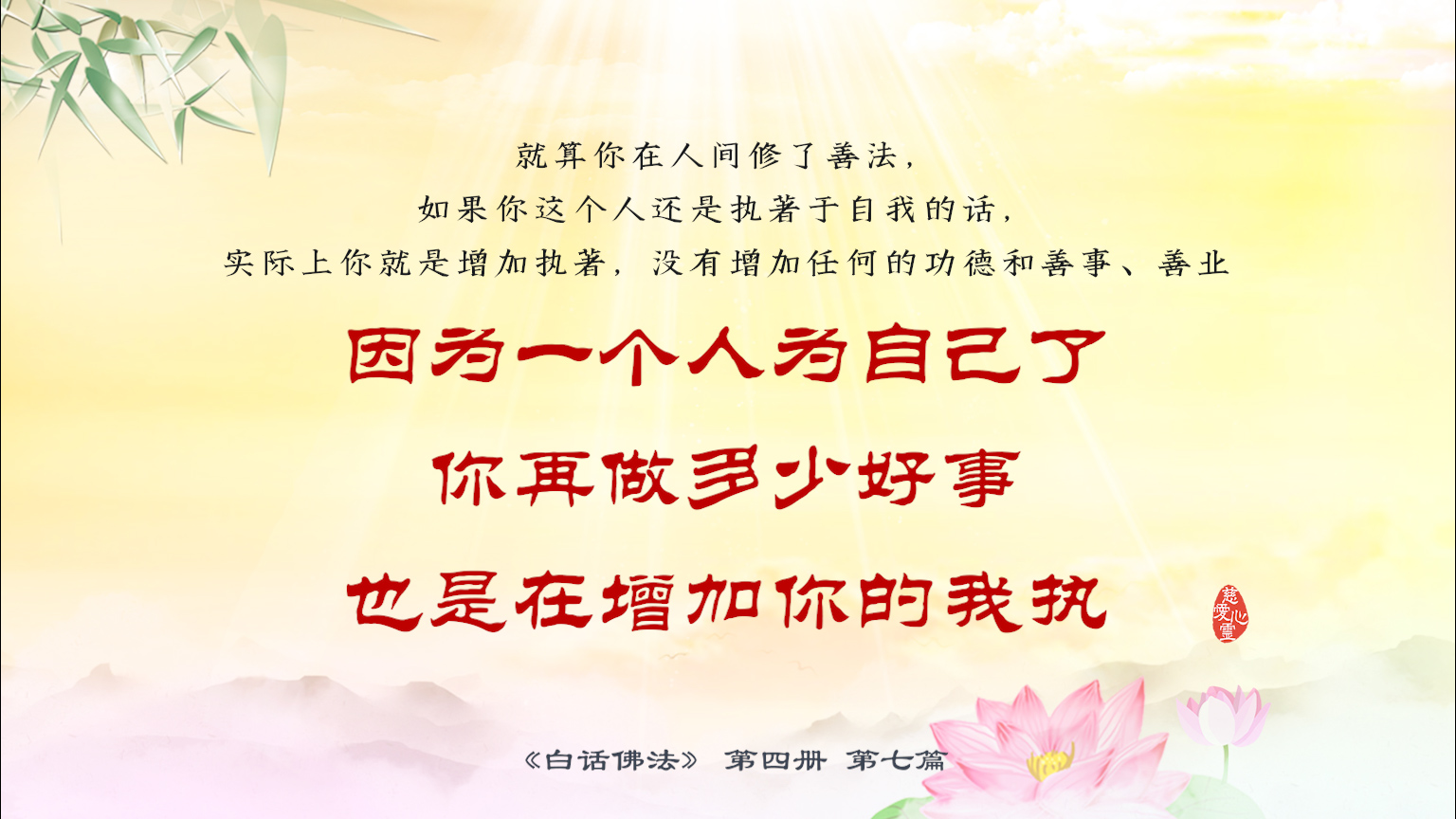 不限会员 4-7-10 就算你在人间修了善法,如果你这个人还是执着于自我的话,实际上你就是增加执着,没有增加任何的功德和善事、善业。因为一个人为自己了,你再做多少好事也是在增加你.【图】