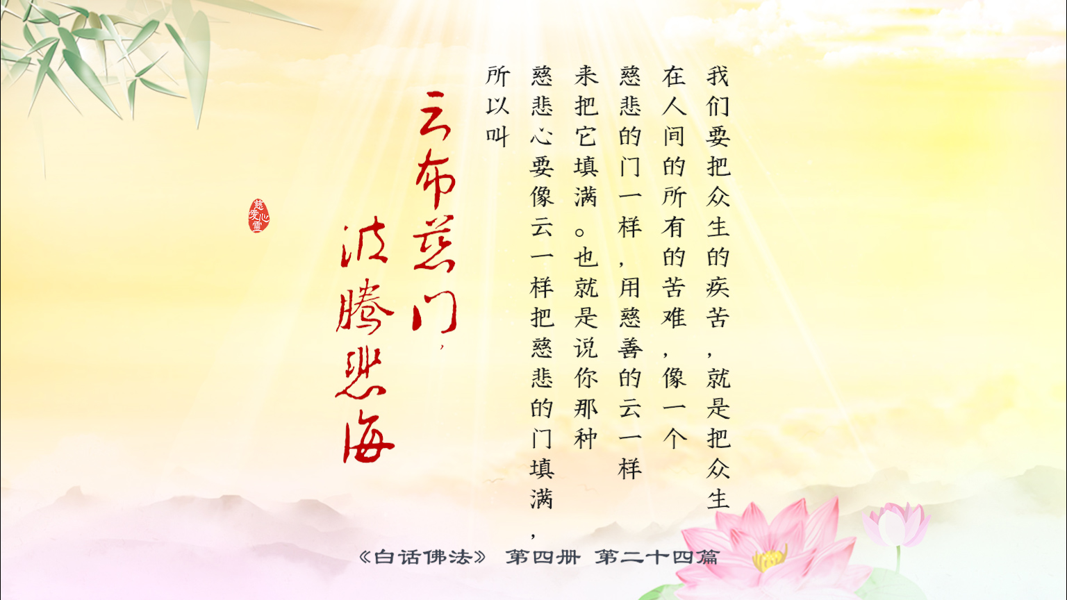 下一篇 : 4-24-9 “云布慈门,波腾悲海”。就是慈悲的海在你心中像