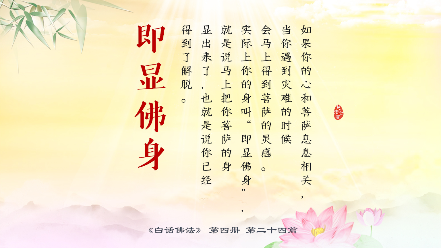 不限会员 4-24-21 如果你的心和菩萨息息相关,当你遇到灾难的时候会马上得到菩萨的灵感。实际上你的身叫“即显佛身”,就是说马上把你菩萨的身显出来了,也就是说你已经得到了解脱.【图】