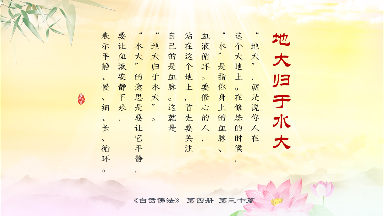 不限会员 4-30-1 “地大”,就是说你人在这个大地上。在修炼的时候,“水”是指你身上的血脉、血液循环。要修心的人,站在这个地上,首先要关注自己的是血脉。这就是“地大归于水大”.【图】