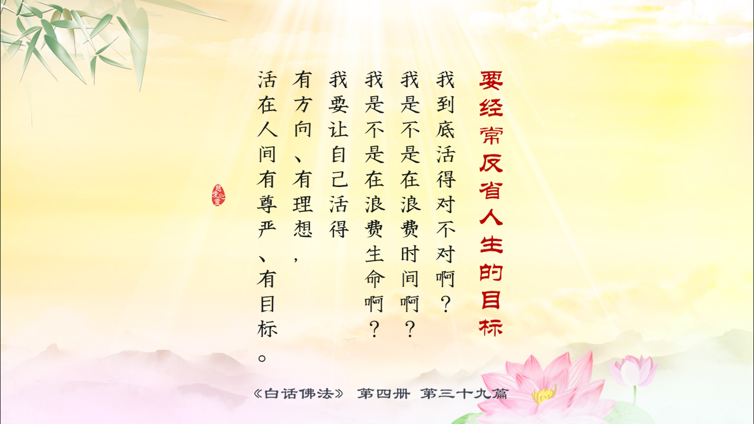 不限会员 4-39-21 要经常反省人生的目标,我到底活得对不对啊?我是不是在浪费时间啊?我是不是在浪费生命啊?我要让自己活得有方向、有理想,活在人间有尊严、有目标.【图】