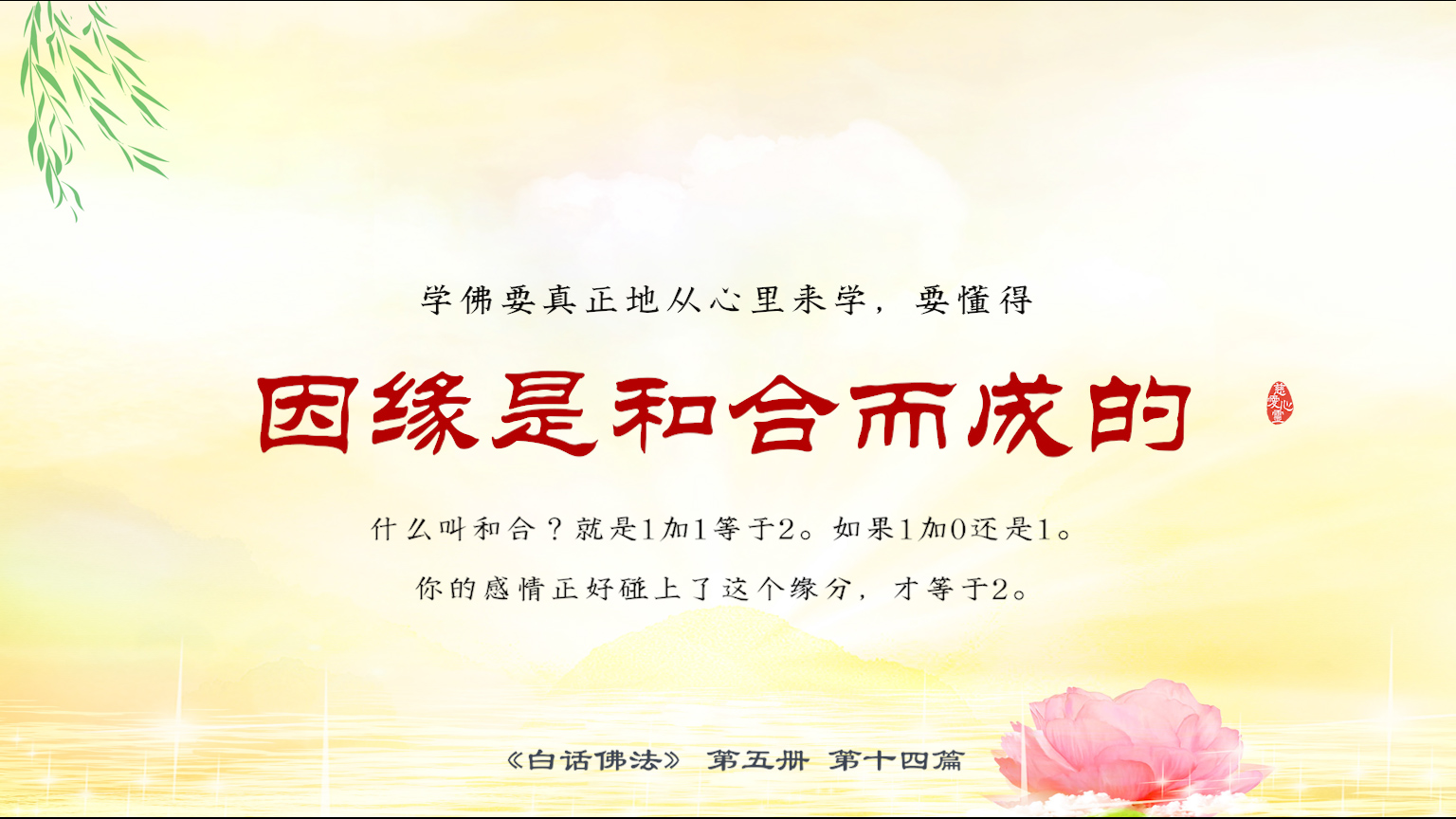 不限会员 5-14-15 学佛要真正地从心里来学,要懂得因缘是和合而成的。什么叫和合?就是 1 加 1 等于 2。如果 1 加 0 还是1。你的感情正好碰上了这个缘分,才等于 2.【图】
