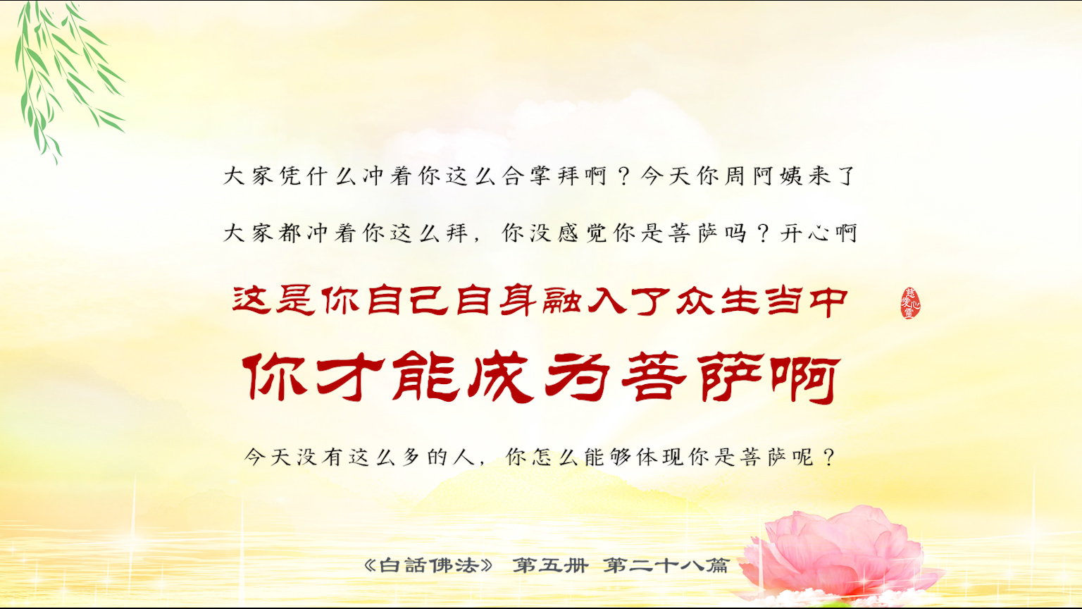 不限会员 5-28-11 大家凭什么冲着你这么合掌拜啊?今天你周阿姨来了,大家都冲着你这么拜,你没感觉你是菩萨吗?开心啊。这是你自己自身融入了众生当中,你才能成为菩萨啊。.【图】