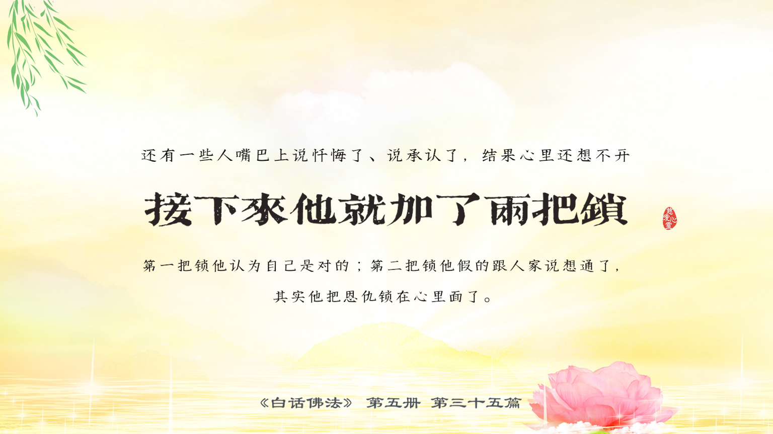 不限会员 5-35-31 还有一些人嘴巴上说忏悔了、说承认了,结果心里还想不开。接下来他就加了两把锁。第一把锁他认为自己是对的;第二把锁他假的跟人家说想通了,其实他把恩仇锁在心里面.【图】