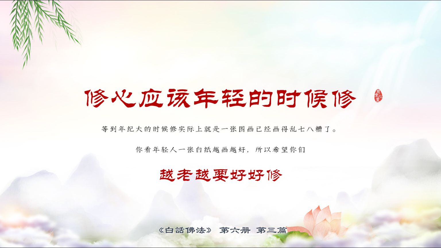 不限会员 6-3-22修心应该年轻的时候修,等到年纪大的时候修实际上就是一张图画已经画得乱七八糟了。你看年轻人一张白纸越画越好,所以希望你们越老越要好好修。【图】