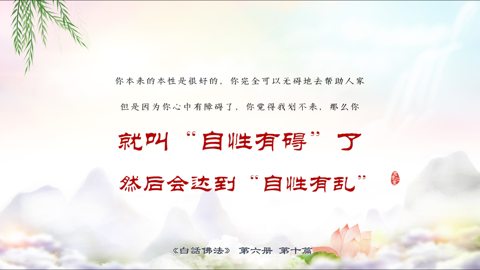不限会员 6-10-20 你本来的本性是很好的,你完全可以无碍地去帮助人家,但是因为你心中有障碍了,你觉得我划不来,那么你就叫“自性有碍”了,然后会达到“自性有乱”【图】