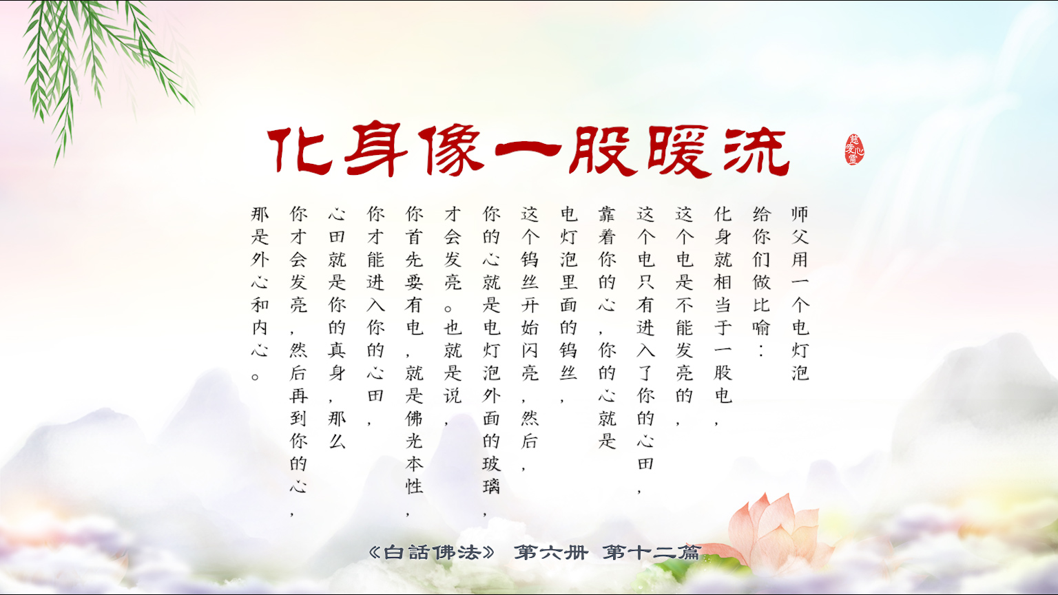 不限会员 6-12-8 化身像一股暖流,师父用一个电灯泡给你们做比喻:化身就相当于一股电,这个电是不能发亮的,这个电只有进入了你的心田,靠着你的心,【图】