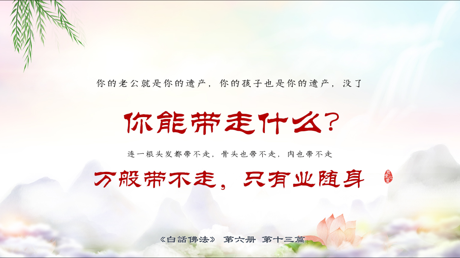 不限会员 6-13-20你的老公 就是你的遗产,你的孩子也是你的遗产,没了。你能带走什么?连一根头发都带不走,骨头也带不走,肉也带不走,万般带不走,只有业随身【图】