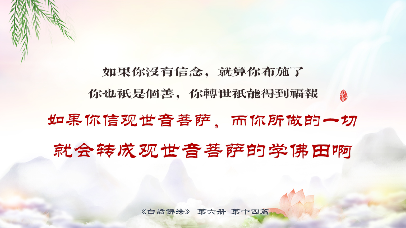 不限会员 6-14-12 如果 你没有信念,就算你布施了,你也只是个善,你转世只能 得到福报;如果你信观世音菩萨,而你所做的一切就会转 成观世音菩萨的学佛田啊【图】