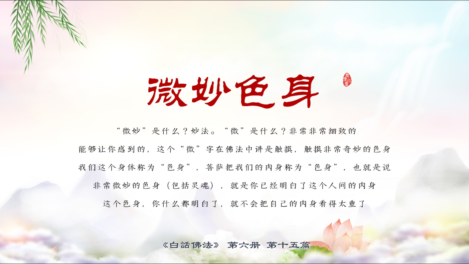 不限会员 6-15-10 “微妙”是什么?妙法。“微”是什么?非常非常细致的,能够让你感到的,这个“微”字在佛法中讲是触摸,触摸非常奇妙的色身。我们这个身体称为“色身”【图】