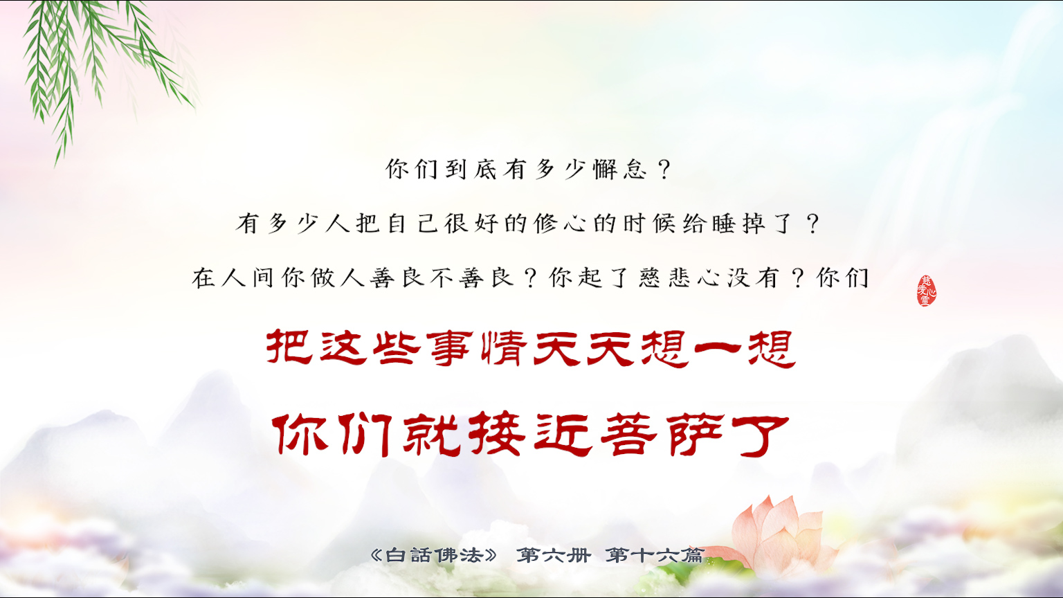 不限会员 6-16-35你们到底有多少懈怠?有多少人把自己很好的修心的时候给睡掉了?在人间你做人善良不善良?你起了慈悲心没有?你们把这些事情 天天想一想,你们就接近菩萨了。【图】