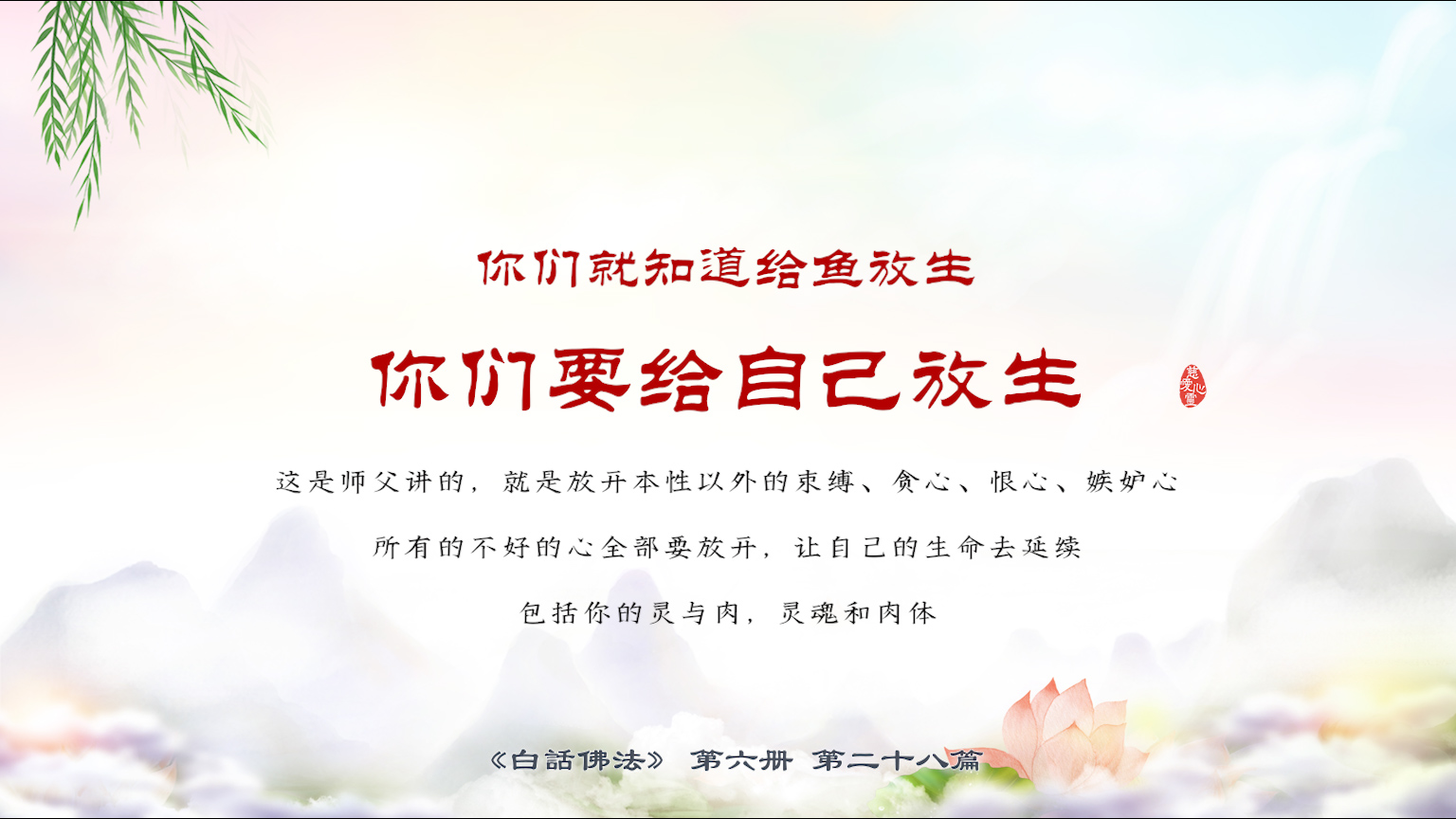 不限会员 6-28-28你们就知道给鱼放生,你们要给自己放生。这是师父讲的,就是放开本性以外的束缚、贪心、恨心、嫉妒心,所有的不好的心全部要放开,让自己的生命去延续,包括你的灵与肉【图】