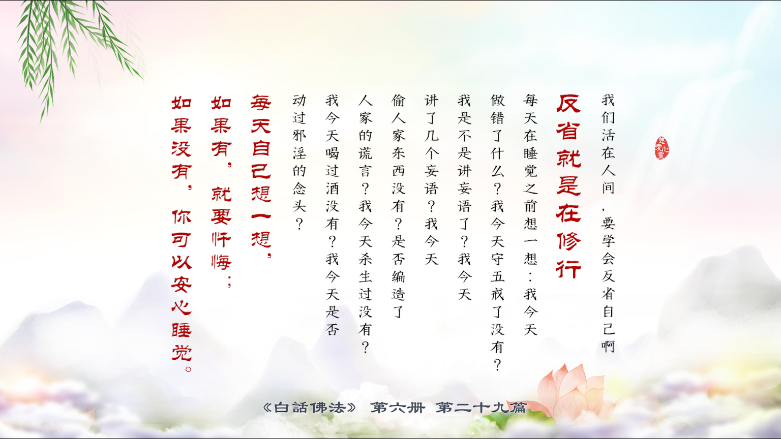 不限会员 6-29-17我们活在人间,要学会反省自己啊,反省就是在修行。每天在睡觉之前想一想:我今天做错了什么?我今天守五戒了没有?我是不是讲妄语了?我今天讲了几个妄语?【图】