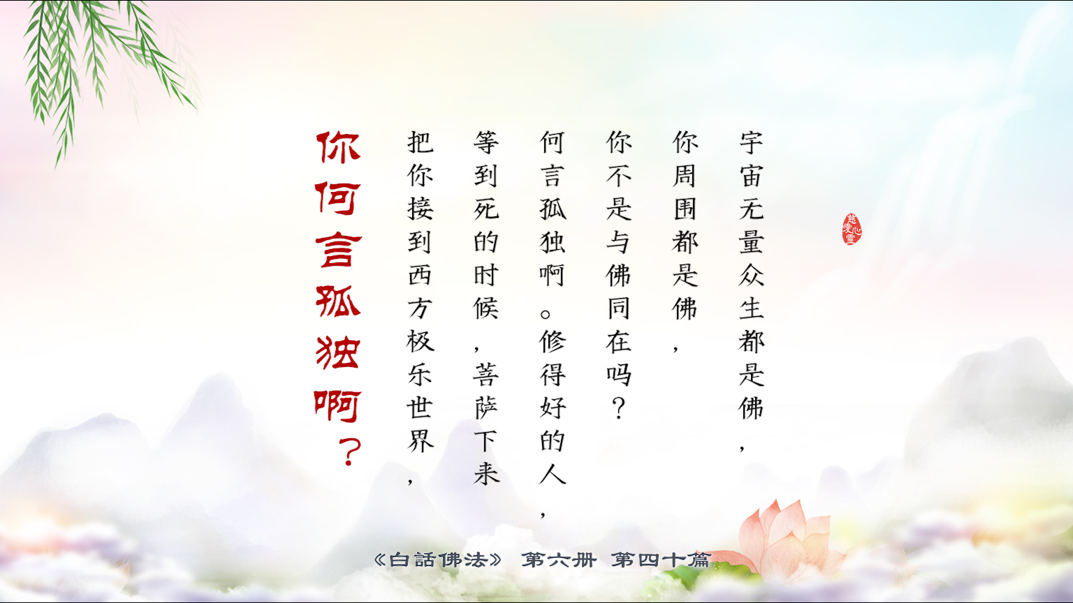 不限会员 6-40-6宇宙无量众生都是佛,你周围都是佛,你不是与佛同在吗?何言孤独啊。修得好的人,等到死的时候,菩萨下来把你接到西方极乐世界,你何言孤独啊?【图】