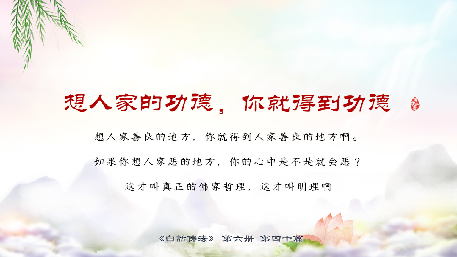 不限会员 6-40-22想人家的功德,你就得到功德啊,想人家善良的地方,你就得到人家善良的地方啊。如果你想人家恶的地方,你的心中是不是就会恶?这才叫真正的佛家哲理,这才叫明理啊。【图】
