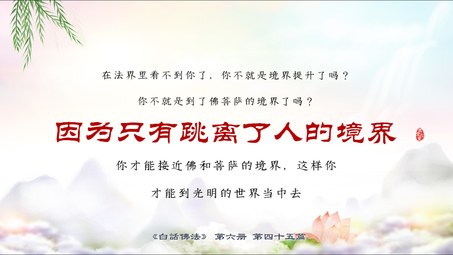 不限会员 6-45-6在法界里看不到你了,你不就是境界提升了吗?你不就是到了佛菩萨的境界了吗?因为只有跳离了人的境界,你才能接近佛和菩萨的境界,这样你才能到光明的世界当中去。【图】