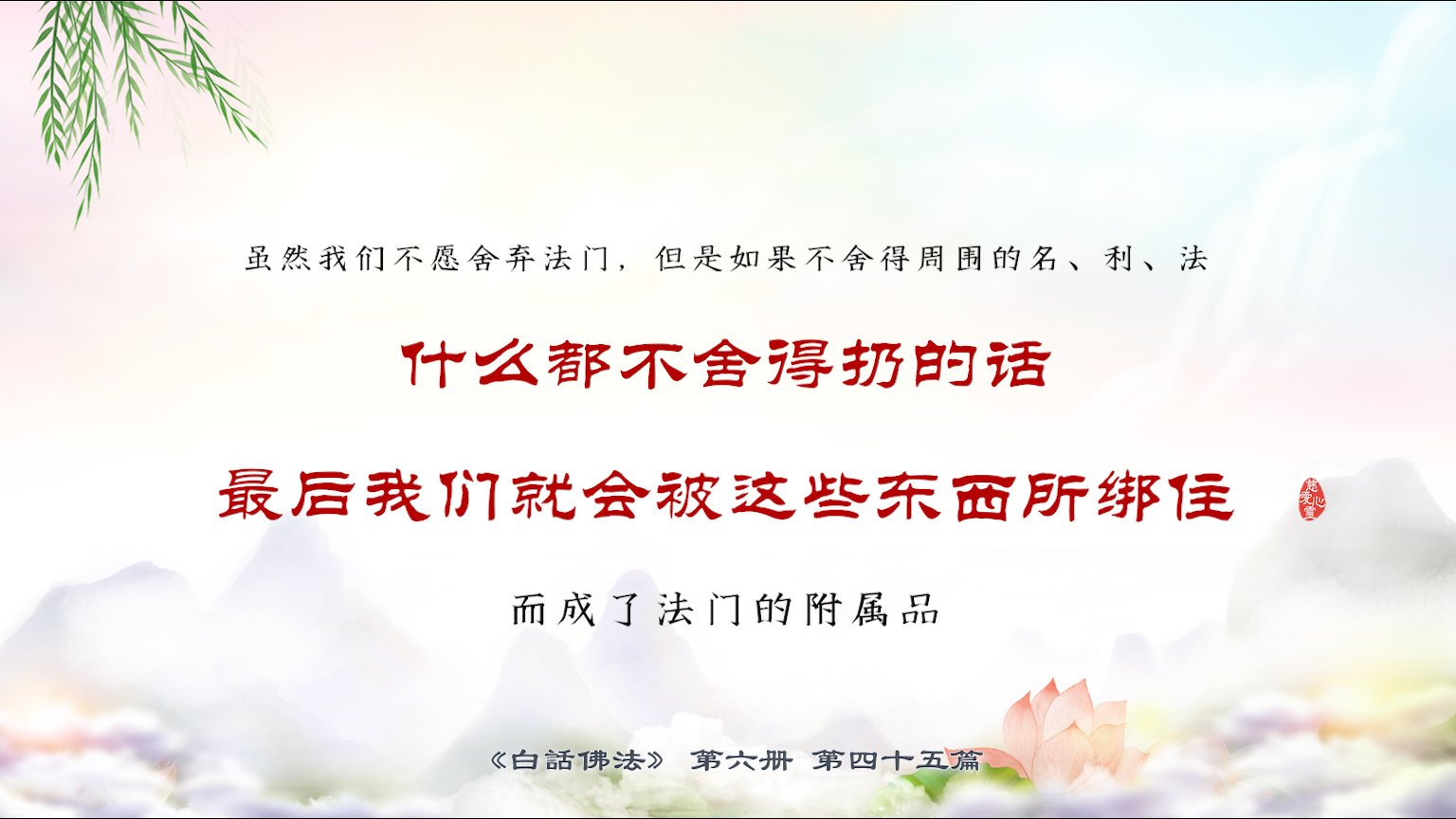 不限会员 6-45-20虽然我们不愿舍弃法门,但是如果不舍得周围的名、利、法,什么都不舍得扔的话,最后我们就会被这些东西所绑住,而成了法门的附属品。【图】