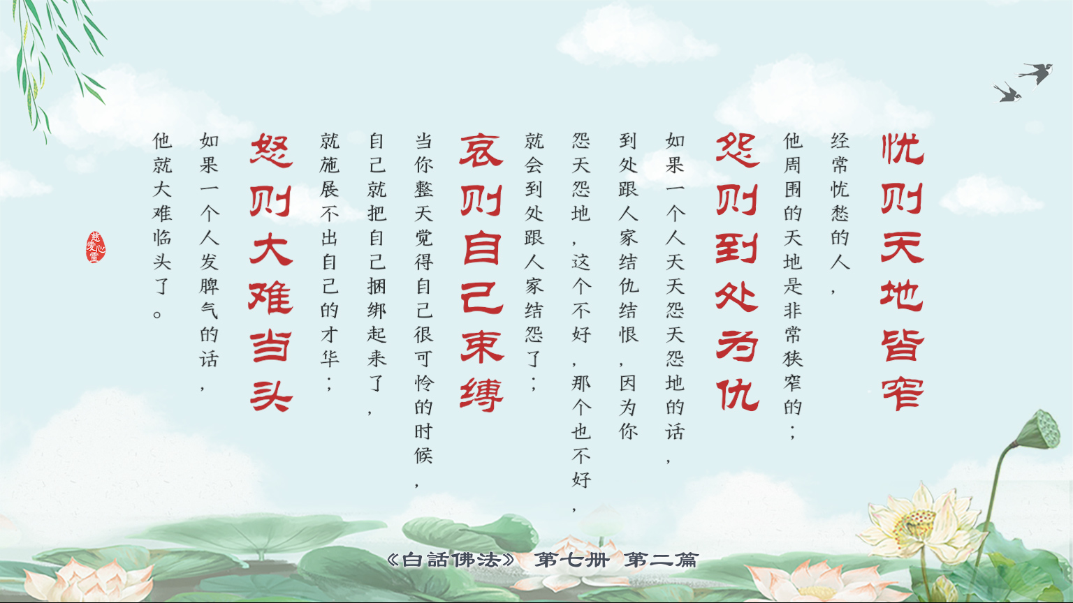 不限会员 7-2-12“忧则天地皆窄”,经常忧愁的人,他周围的天地是非常狭窄的;“怨则到处为仇”,如果一个人天天怨天怨地的话,到处跟人家结仇结恨,因为你怨天怨地,这个不好【图】
