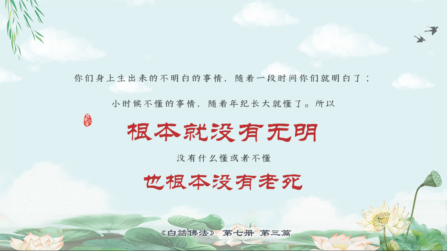不限会员 7-3-2你们身上生出来的不明白的事情,随着一段时间你们就明白了;小时候不懂的事情,随着年纪长大就懂了。所以根本就没有无明,没有什么懂或者不懂,也根本没有老死。【图】