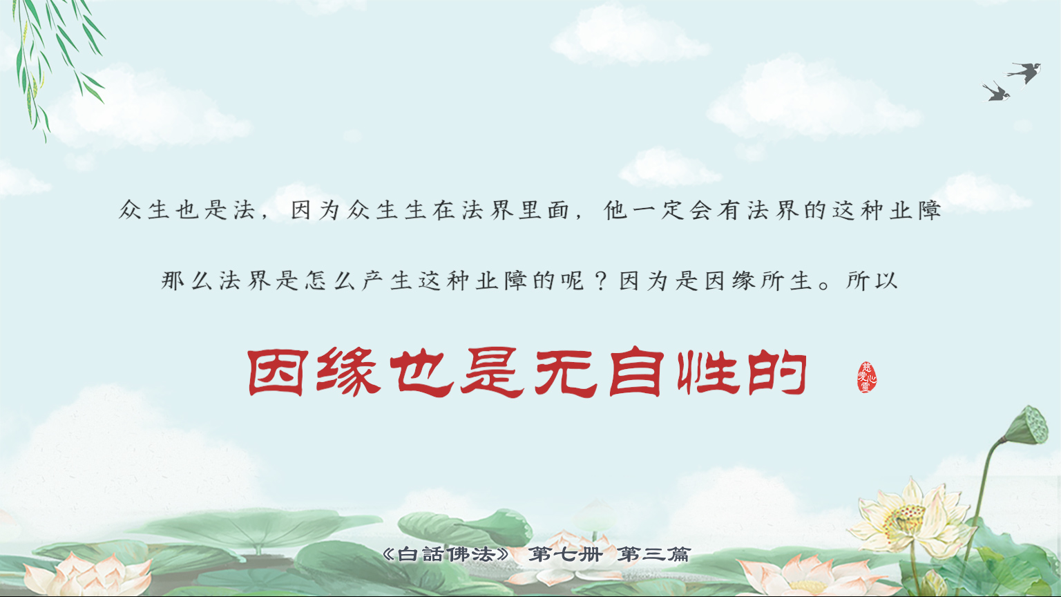 不限会员 7-3-28 众生也是法,因为众生生在法界里面,他一定会有法界的这种业障。那么法界是怎么产生这种业障的呢?因为是因缘所生。所以因缘也是无自性的。【图】