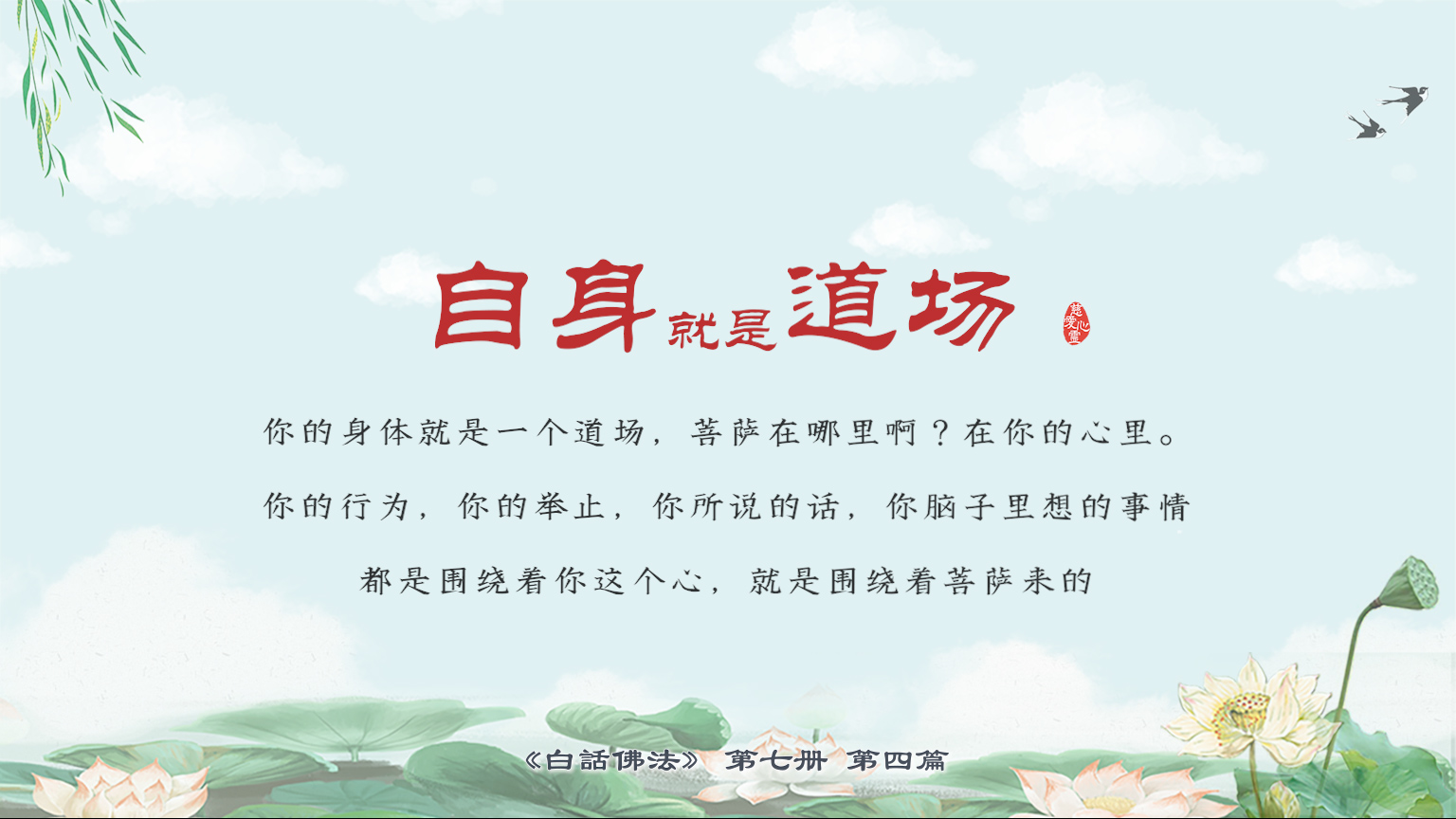 不限会员 7-4-20 自身就是一个道场。你的身体就是一个道场,菩萨在哪里啊?在你的心里。你的行为,你的举止,你所说的话,你脑子里想的事情都是围绕着你这个心,就是围绕着菩萨来的。【图】