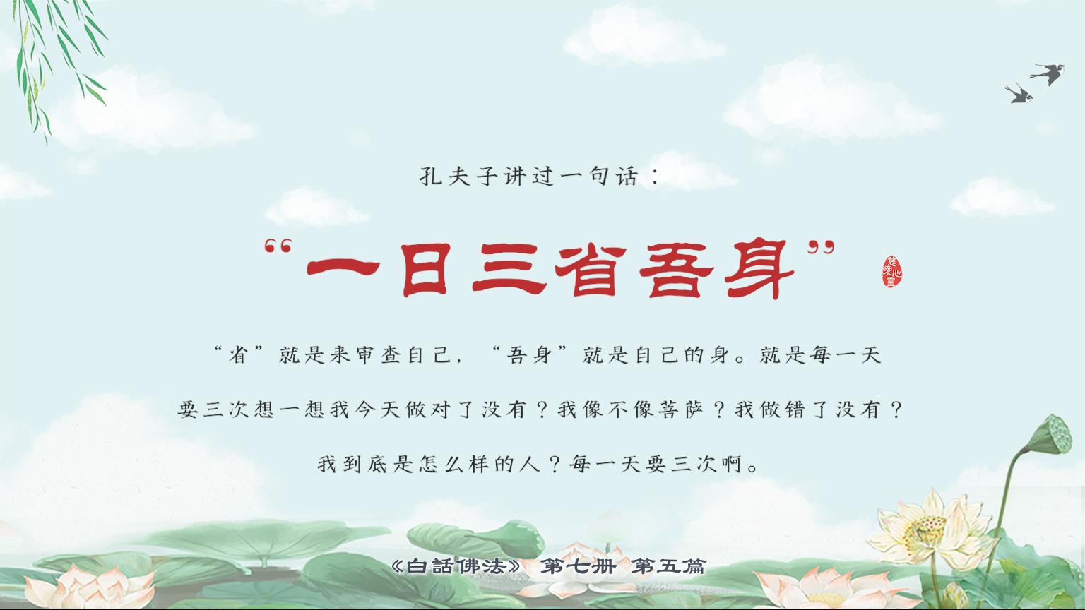 不限会员 7-5-30孔夫子讲过一句话:“一日三省吾身。”“省”就是来审查自己,“吾身”就是自己的身。就是每一天要三次想一想我今天做对了没有?我像不像菩萨?我做错了没有?【图】