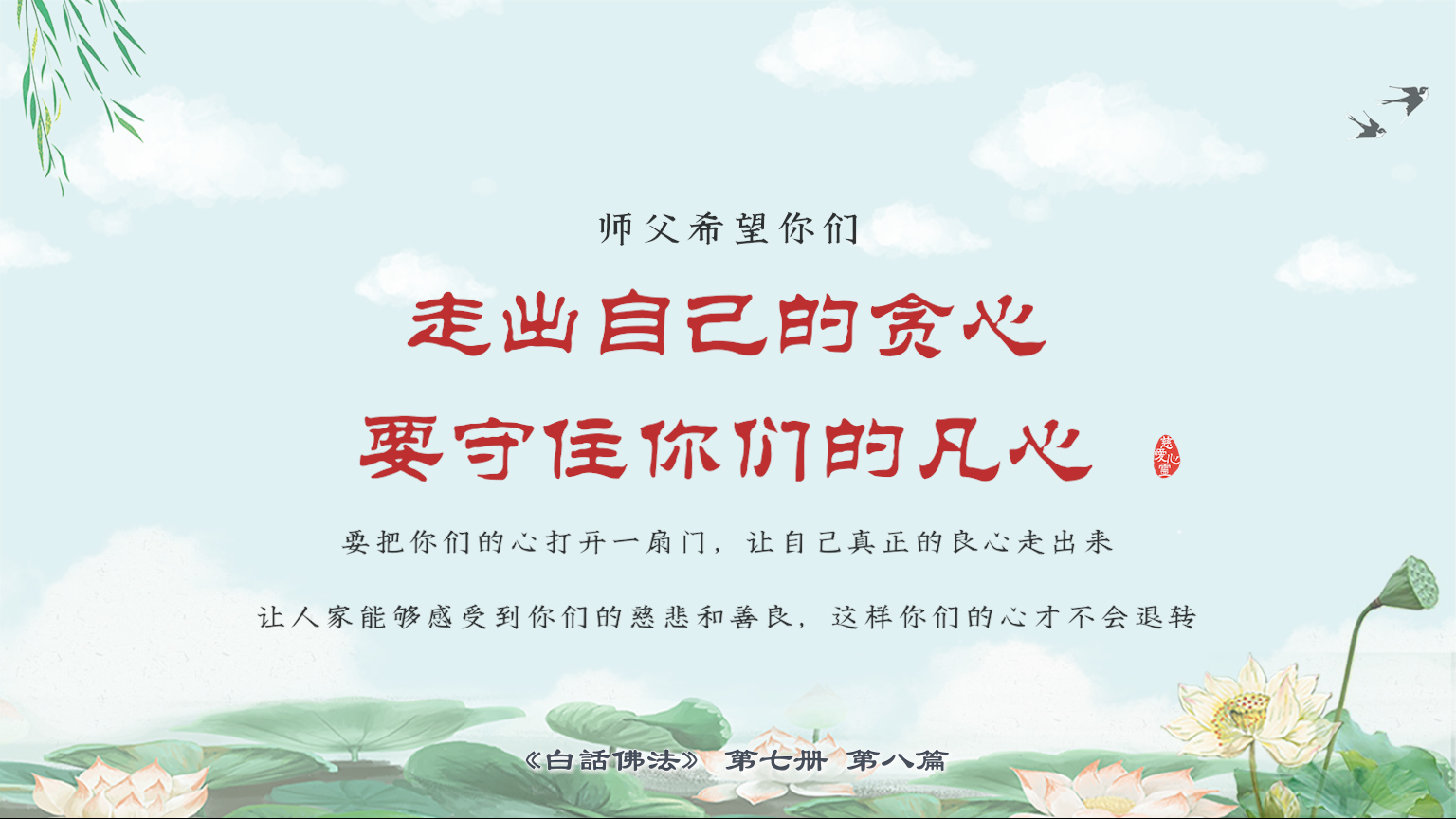 不限会员 7-8-1师父希望你们走出自己的贪心,要守住你们的凡心,要把你们的心打开一扇门,让自己真正的良心走出来,让人家能够感受到你们的慈悲和善良,这样你们的心才不会退转。【图】