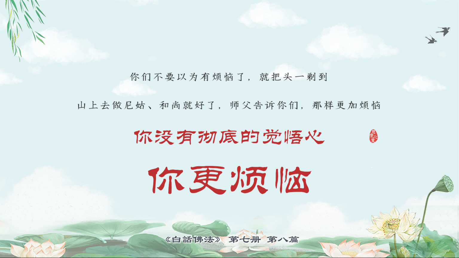不限会员 7-8-4 你们不要以为有烦恼了,就把头一剃到山上去做尼姑、和尚就好了,师父告诉你们,那样更加烦恼,你没有彻底的觉悟心,你更烦恼。【图】