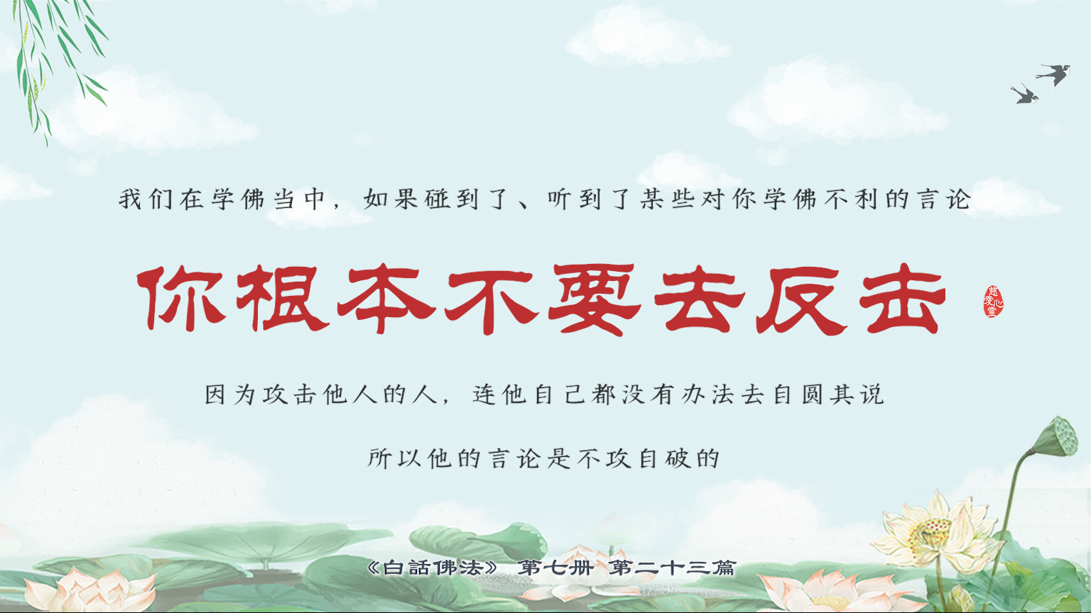 不限会员 7-23-5我们在学佛当中,如果碰到了、听到了某些对你学佛不利的言论,你根本不要去反击,因为攻击他人的人,连他自己都没有办法去自圆其说,所以他的言论是不攻自破的。【图】