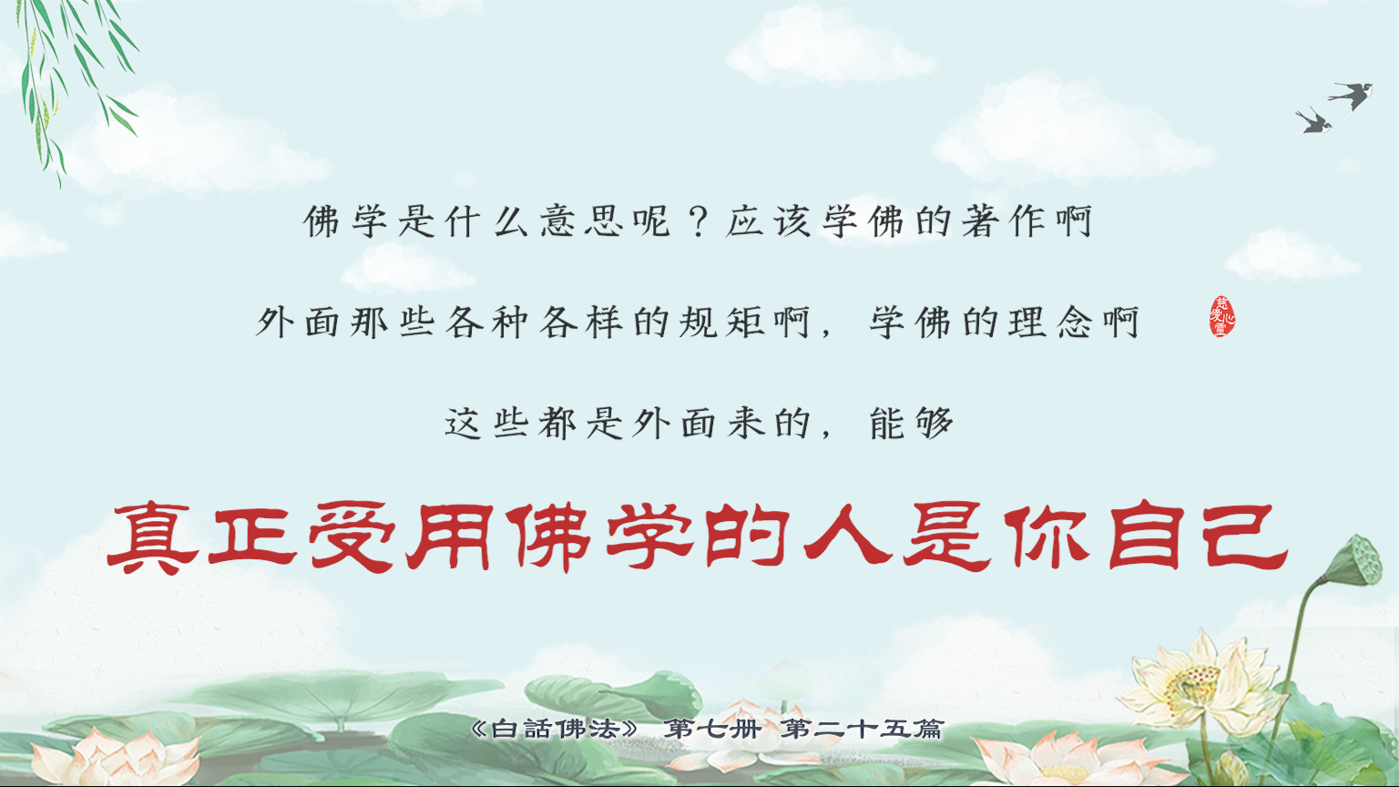 不限会员 7-25-6佛学是什么意思呢?应该学佛的著作啊,外面那些各种各样的规矩啊,学佛的理念啊,这些都是外面来的,能够真正受用佛学的人是你自己。【图】