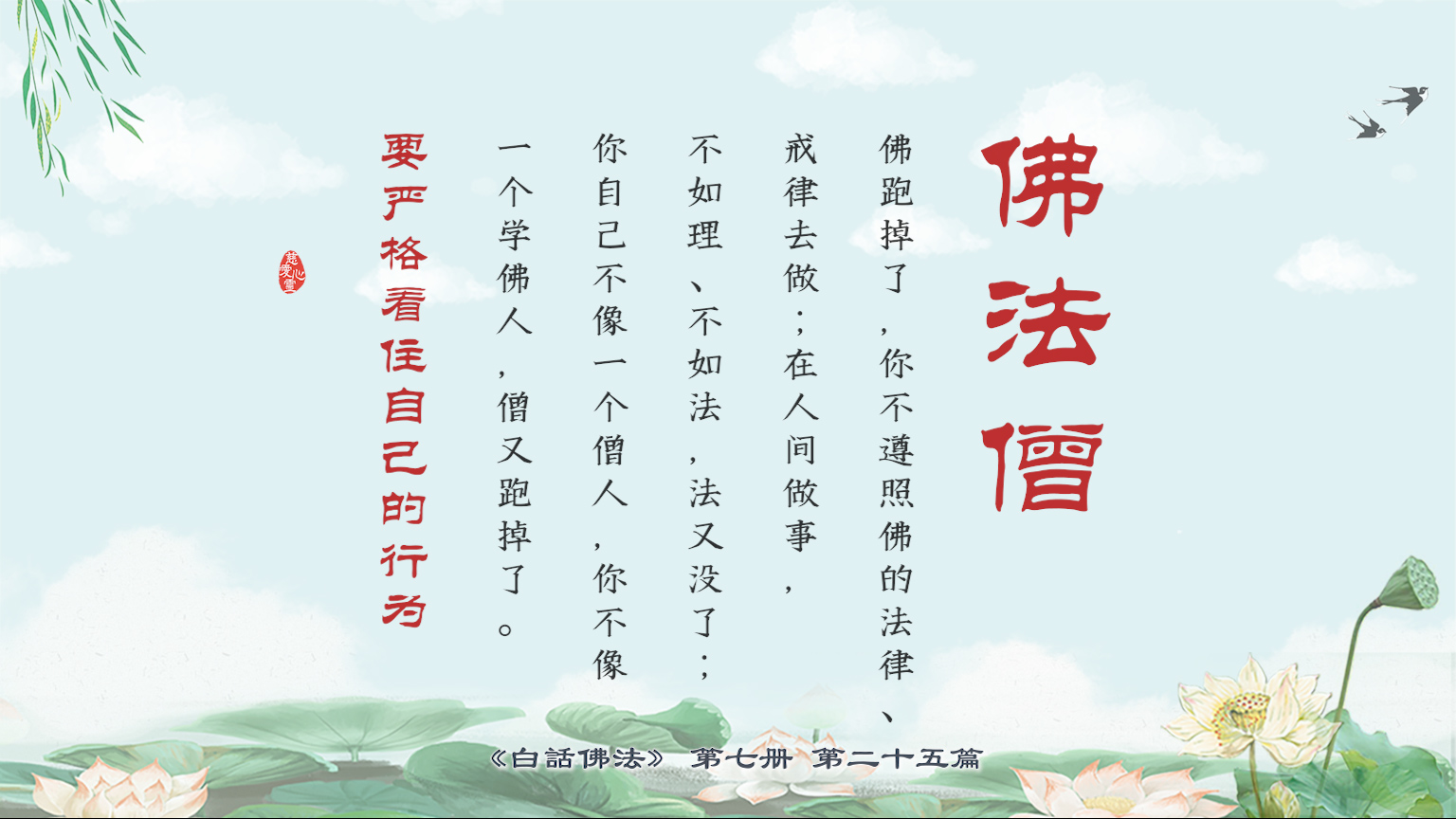 不限会员 7-25-11佛法僧,佛跑掉了,你不遵照佛的法律、戒律去做;在人间做事,不如理、不如法,法又没了;你自己不像一个僧人,你不像一个学佛人,僧又跑掉了。所以,要严格看住自己的行为【图】