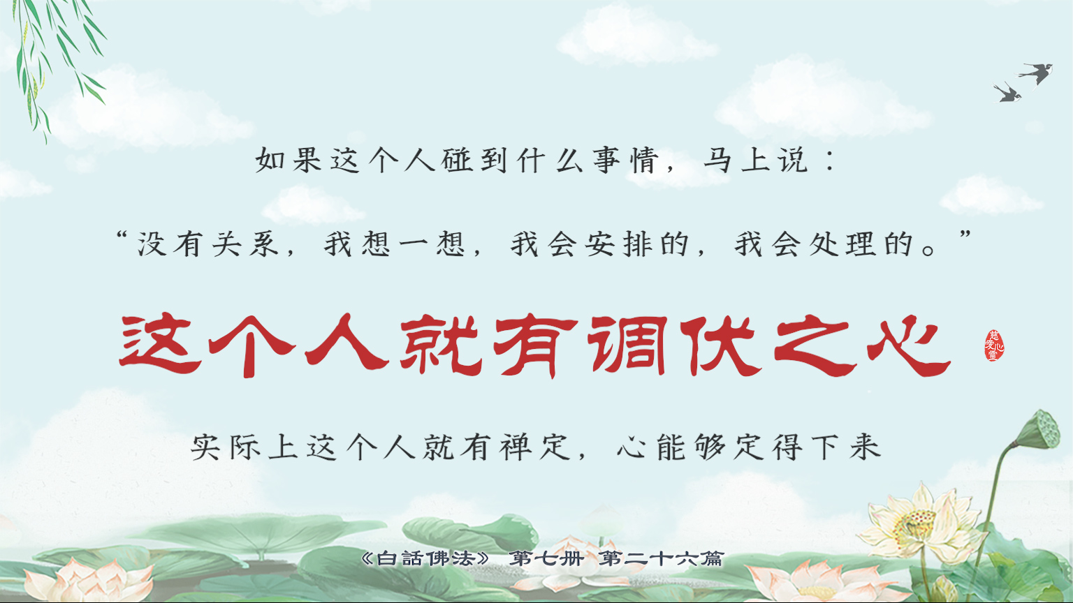 不限会员 7-26-9如果这个人碰到什么事情,马上说:“没有关系,我想一想,我会安排的,我会处理的。”这个人就有调伏之心,实际上这个人就有禅定,心能够定得下来。【图】