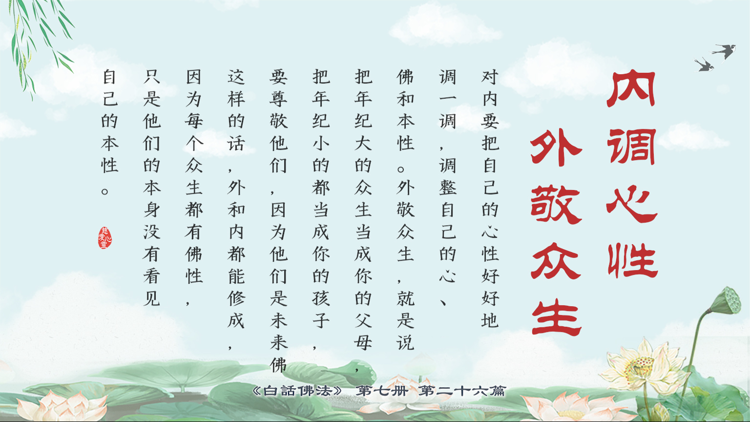 不限会员 7-26-26“内调心性,外敬众生”,对内要把自己的心性好好地调一调,调整自己的心、佛和本性。外敬众生,就是说把年纪大的众生当成你的父母,把年纪小的都当成你的孩子【图】