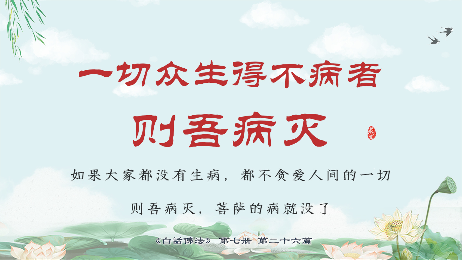 不限会员 7-26-35“一切众生得不病者”,就是一切众生没有生病的,“则吾病灭”。就是说,如果大家都没有生病,都不贪爱人间的一切,则吾病灭,菩萨的病就没了。【图】