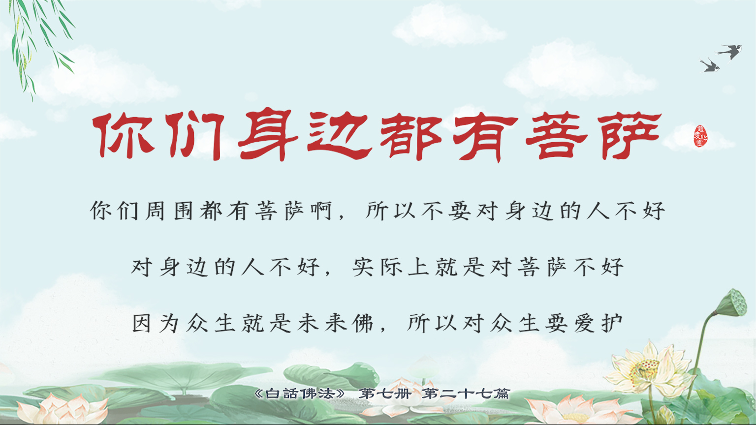 不限会员 7-27-11你们身边都有菩萨,你们周围都有菩萨啊,所以不要对身边的人不好,对身边的人不好,实际上就是对菩萨不好,因为众生就是未来佛,所以对众生要爱护。【图】