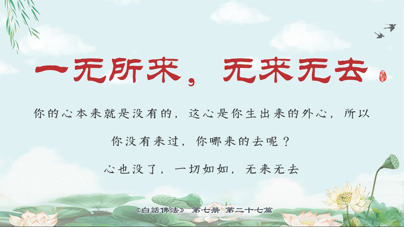 不限会员 7-27-14一无所来,无来无去,实际上你的心本来就是没有的,这心是你生出来的外心,所以,你没有来过,你哪来的去呢?心也没了,一切如如,无来无去。【图】