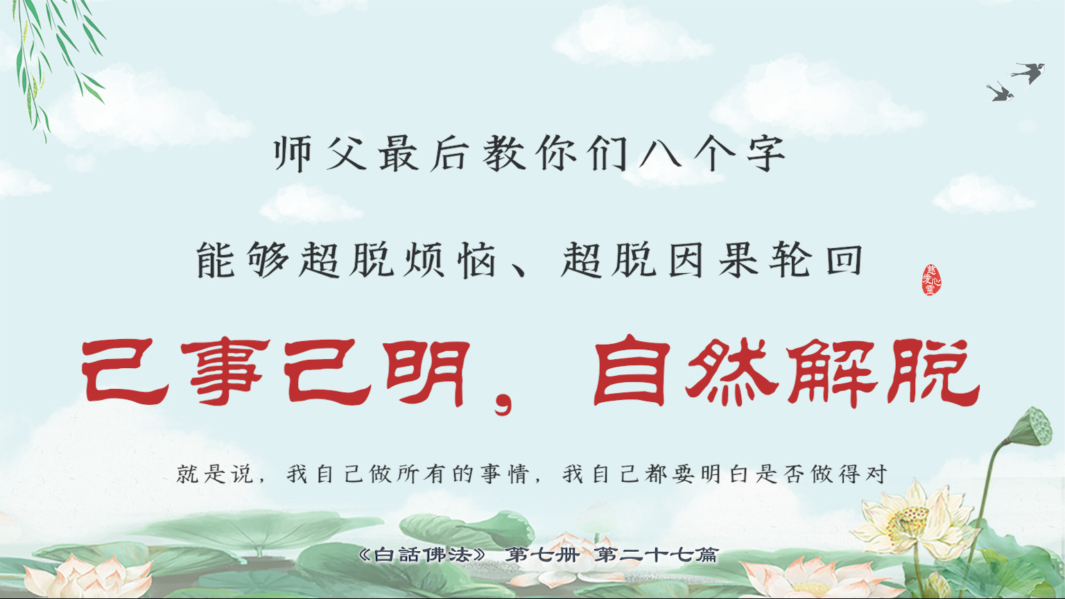 不限会员 7-27-40师父最后教你们八个字能够超脱烦恼、超脱因果轮回:己事己明,自然解脱。就是说,我自己做所有的事情,我自己都要明白是否做得对。【图】
