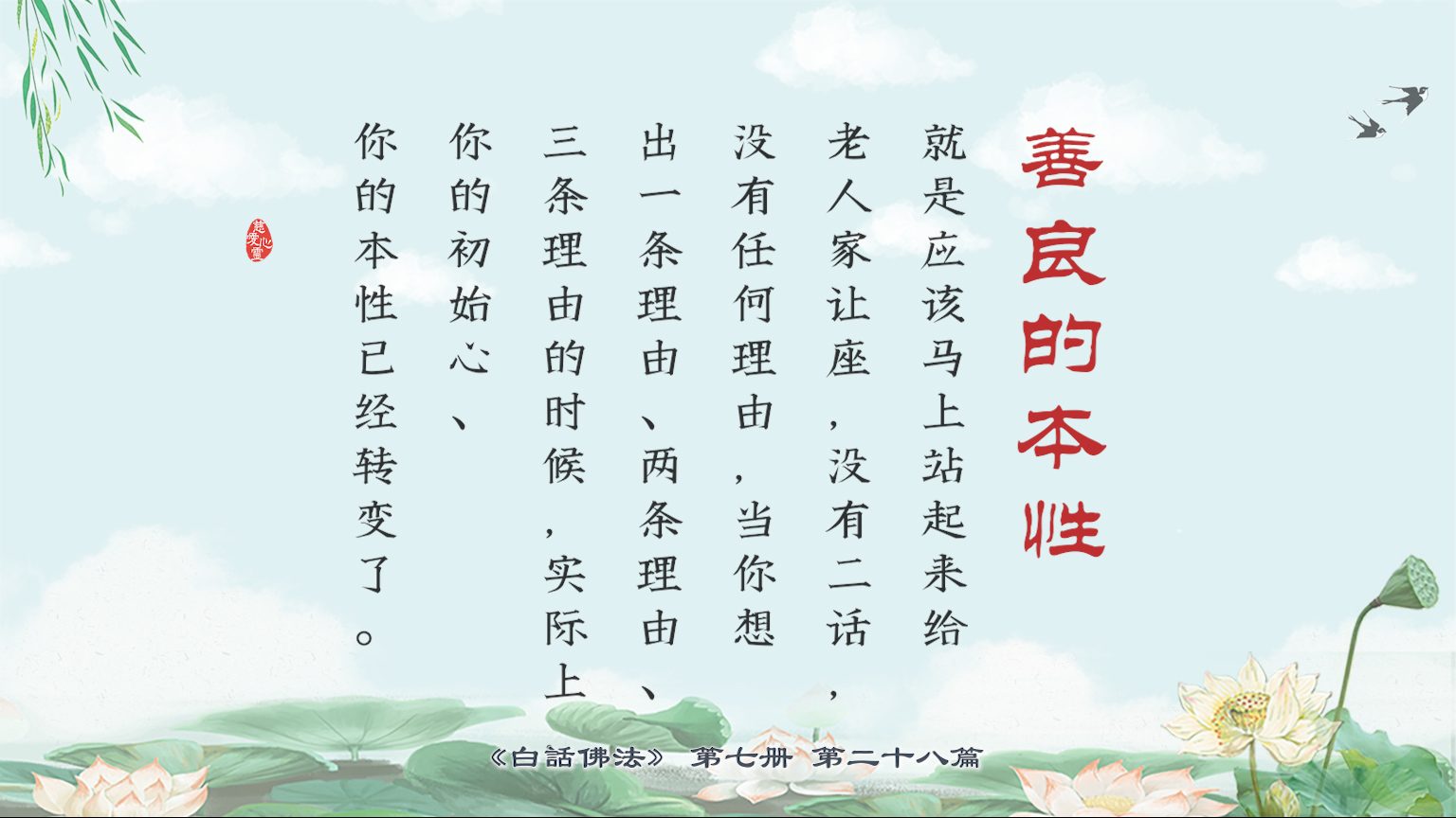 不限会员 7-28-17善良的本性就是应该马上站起来给老人家让座,没有二话,没有任何理由,当你想出一条理由、两条理由、三条理由的时候,实际上,你的初始心、你的本性已经转变了。【图】