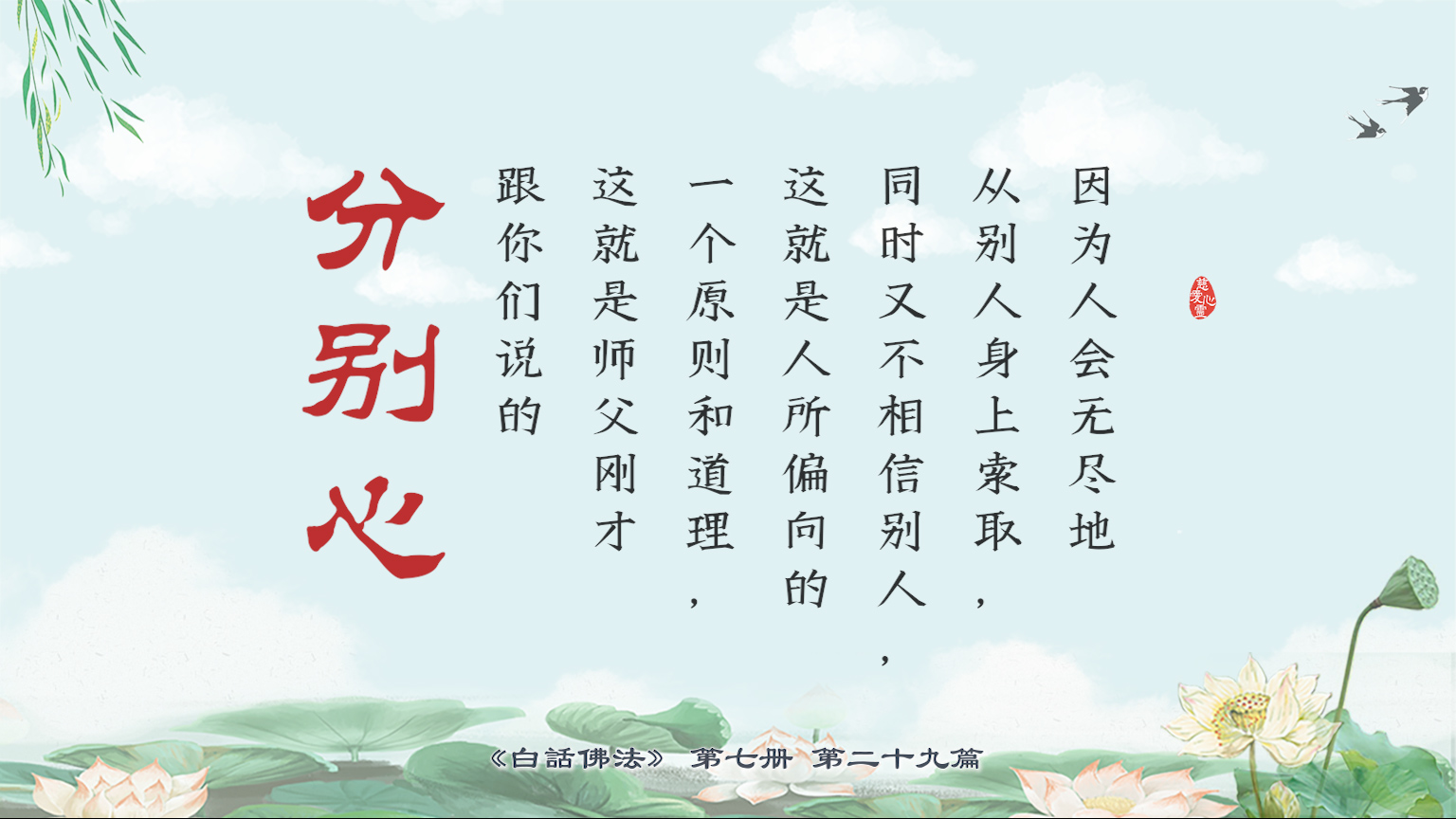 不限会员 7-29-12 因为人会无尽地从别人身上索取,同时又不相信别人,这就是人所偏向的一个原则和道理,这就是师父刚才跟你们说的分别心。【图】