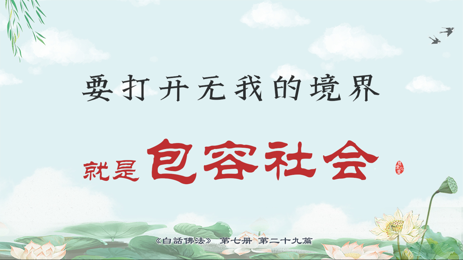 不限会员 7-29-14要打开无我的境界,就是包容社会。我们现在如果把自己的心胸打开...越是没有自己,就越是能包容每一个人和包容这个社会...学佛人在提高境界,你知道这是人道。【图】
