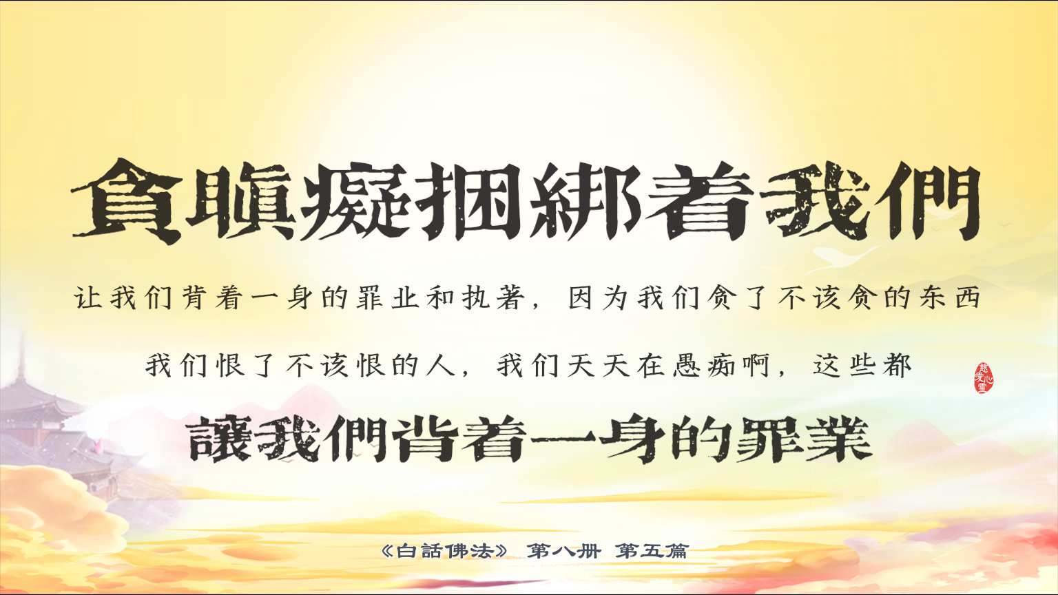 不限会员 8-5-1 贪瞋痴捆绑着我们,让我们背着一身的罪业和执著,因为我们贪了不该贪的东西,我们恨了不该恨的人,我们天天在愚痴啊,这些都让我们背着一身的罪业。【图】