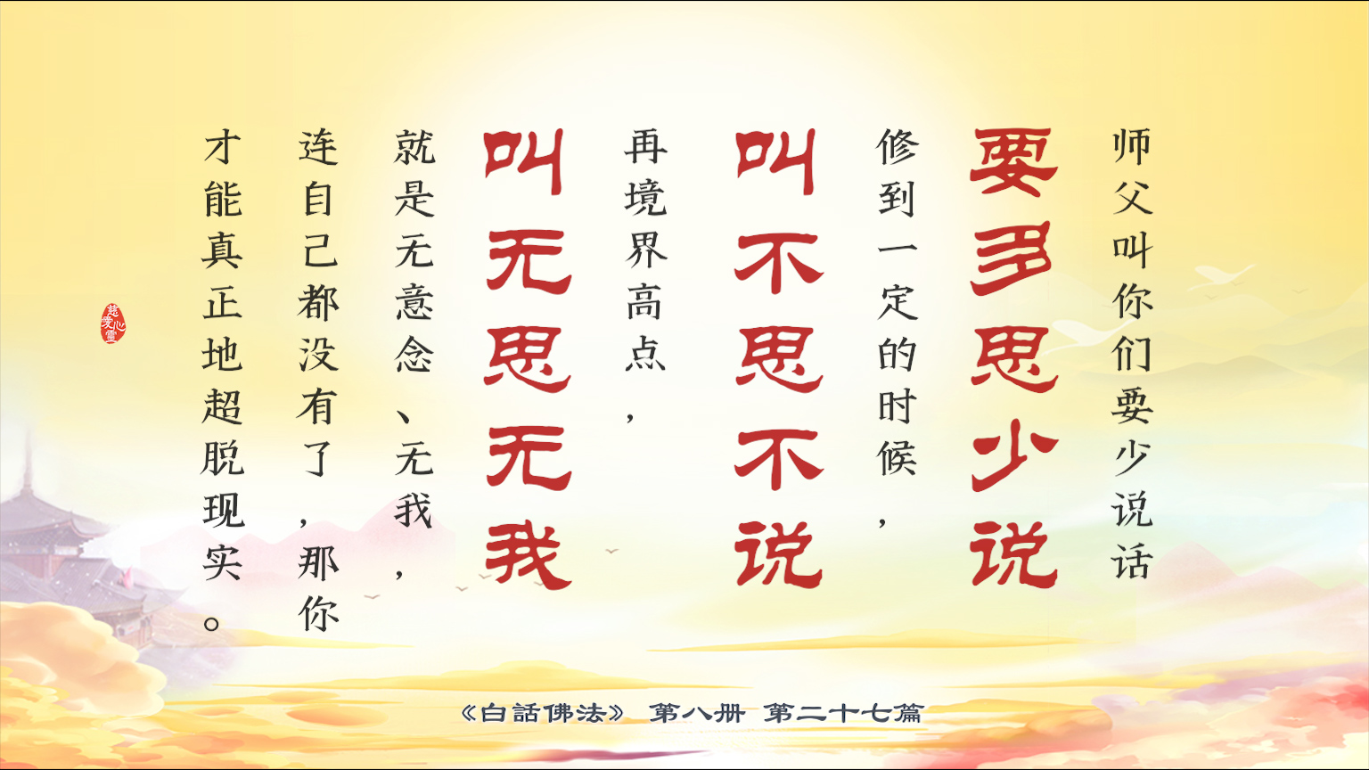 不限会员 8-27-19 师父叫你们要少说话,学佛人要多思少说,修到一定的时候,叫不思不说,再境界高点,叫无思无我,就是无意念、无我,连自己都没有了,那你才能真正地超脱现实。【图】
