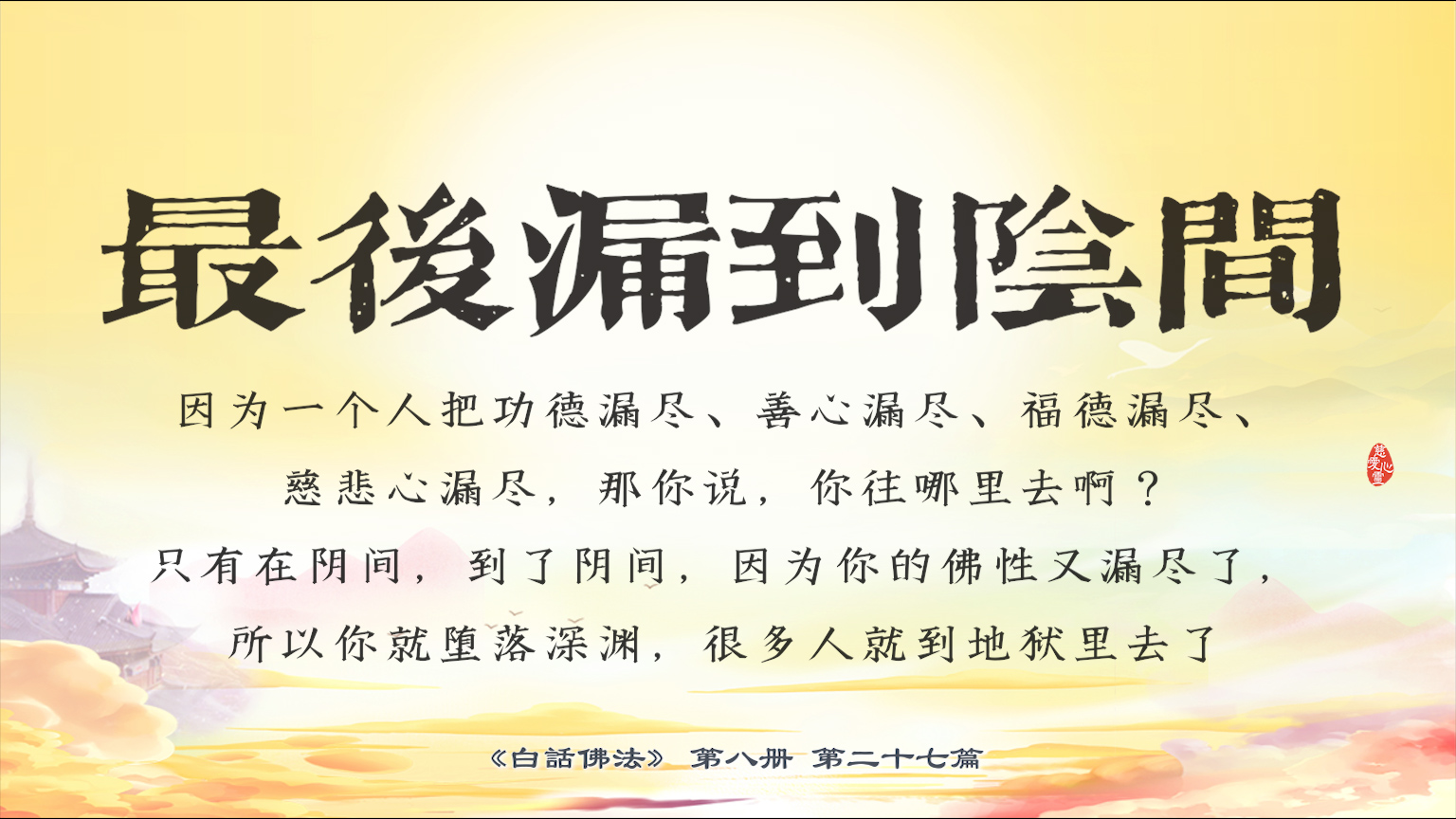 不限会员 8-27-27最后漏到阴间,一个人把功德漏尽、善心漏尽、福德漏尽、慈悲心漏尽...你往哪里去啊?只有在阴间,到了阴间,因为你的佛性又漏尽了..以你就堕落深渊,很多人就到地狱里去了。【图】